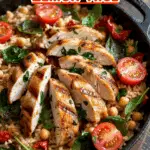Summary: This One-Skillet Greek Chicken and Lemon Rice features seasoned chicken thighs cooked in a skillet and set aside. In the same skillet, a flavorful lemon rice is created by sautéing tomatoes and garlic, then adding cooked rice, chickpeas, fresh spinach, lemon juice, and more fresh tomatoes. The dish is served with the chicken placed on top of the rice and finished with a fresh mixture of diced feta cheese, olive oil, lemon juice, and oregano.